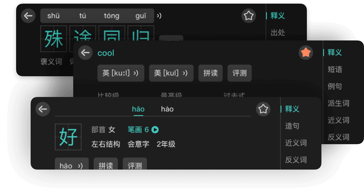 采用真人发音,释义丰富,涵盖K12阶段所有需要学习词汇。