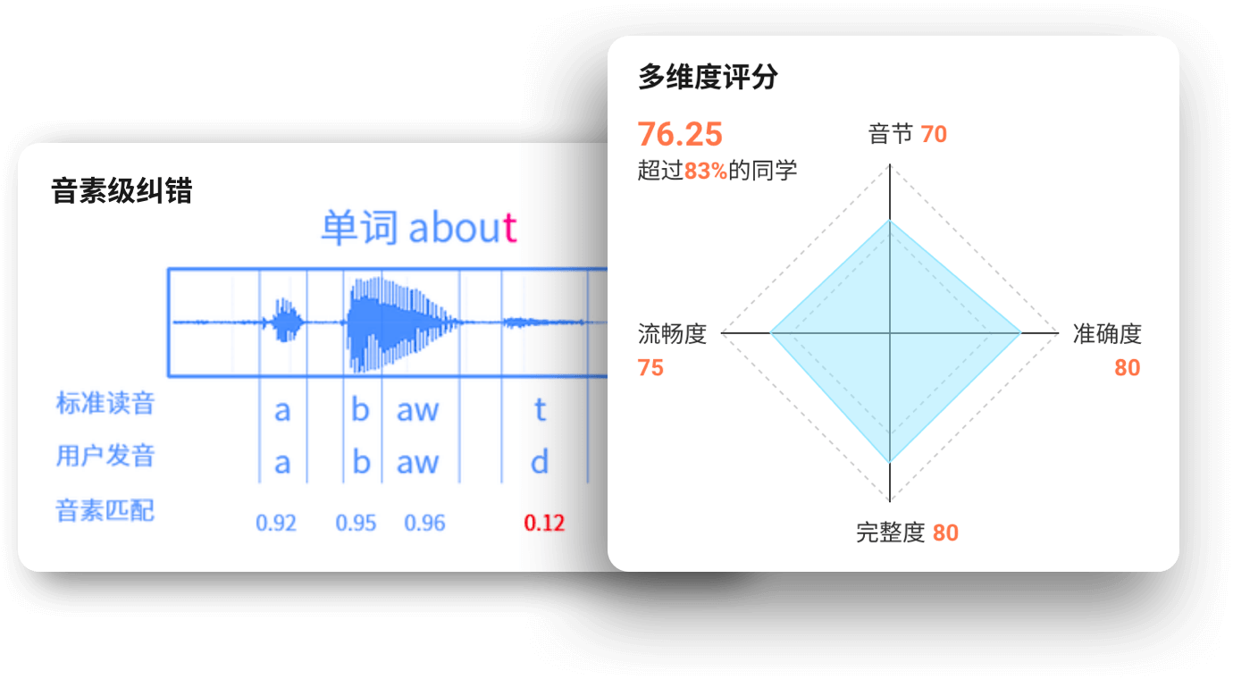 多维度综合评分,提供准确、流畅、完整、声韵、语速等丰富维度;